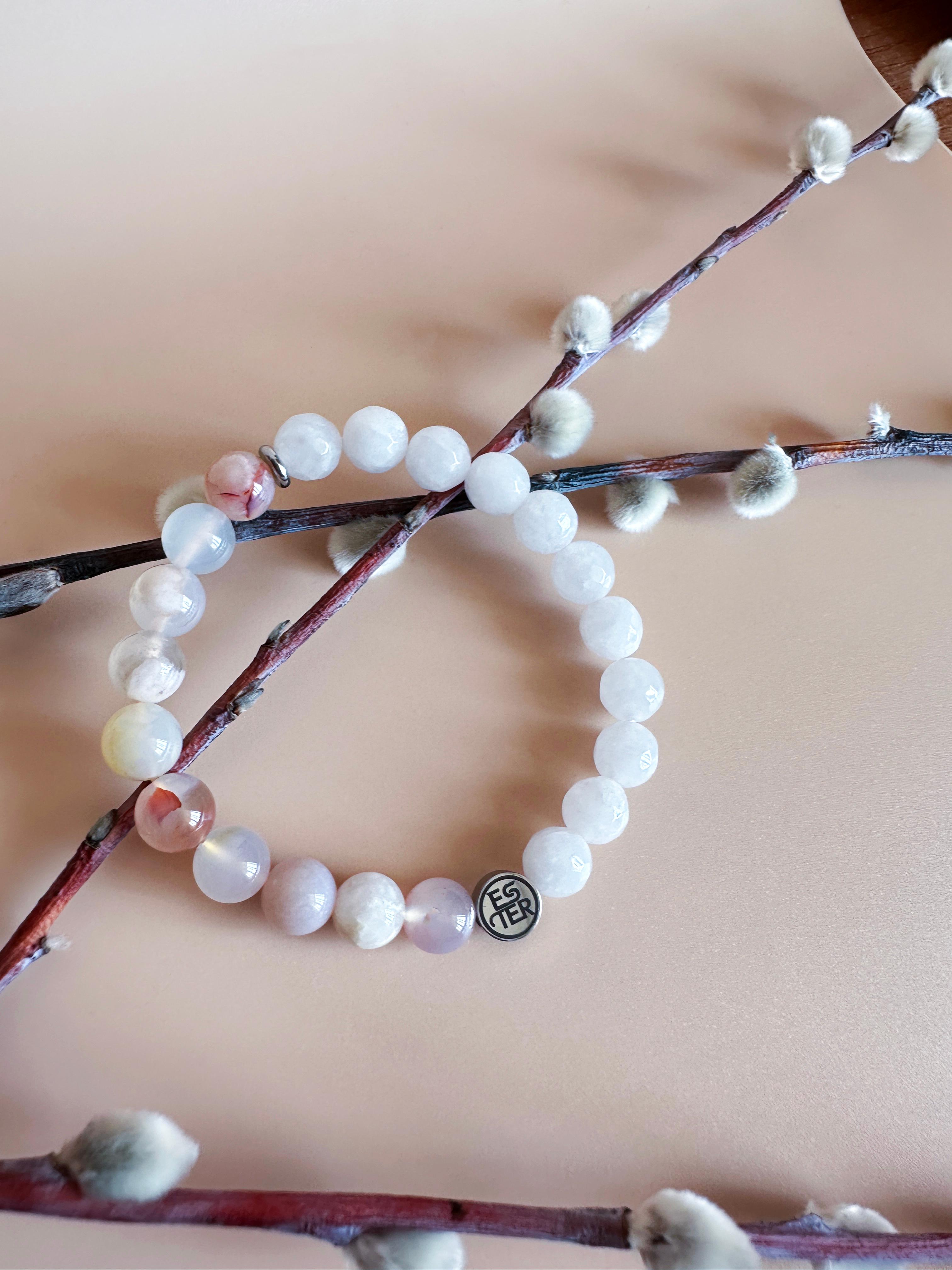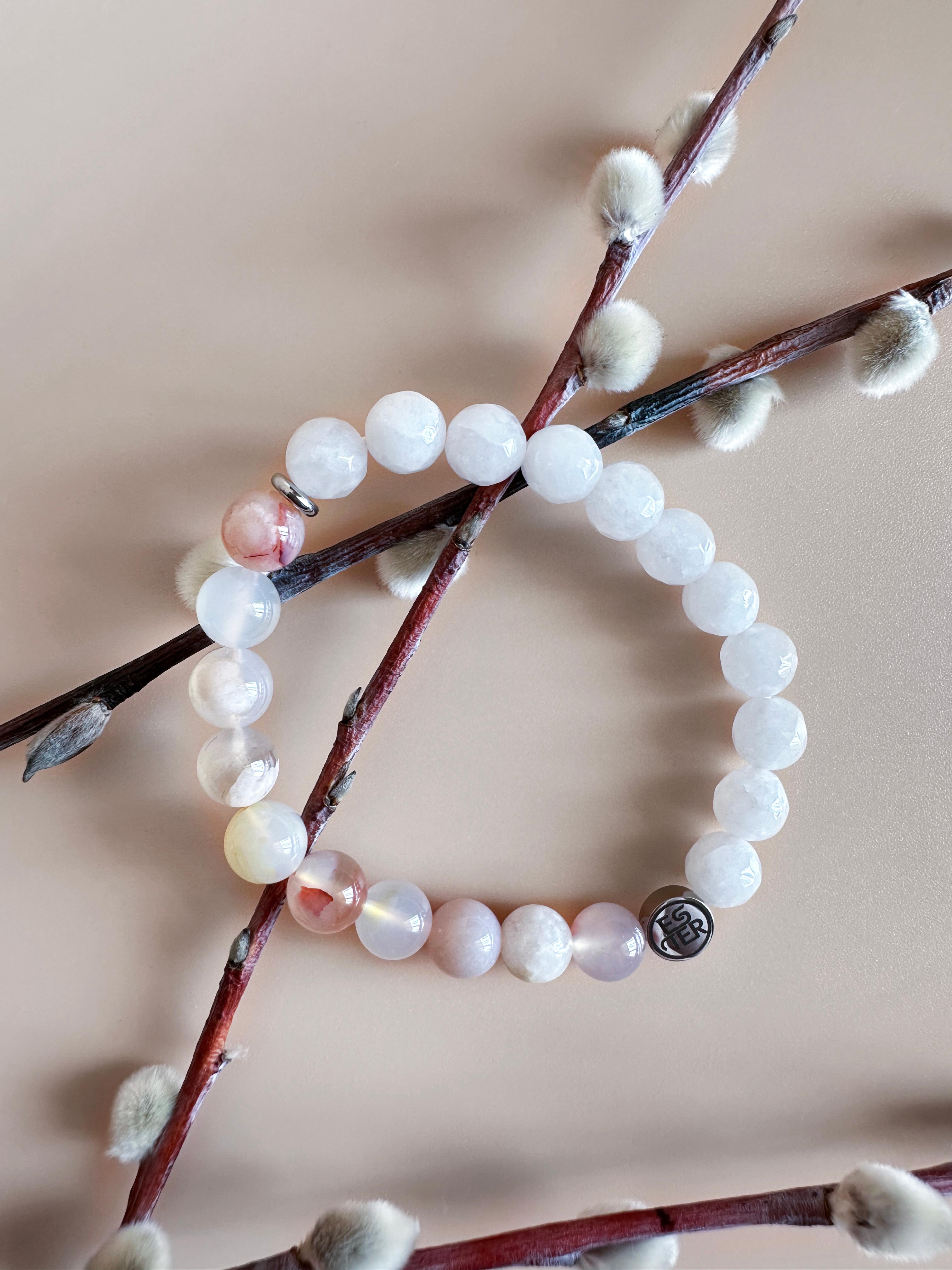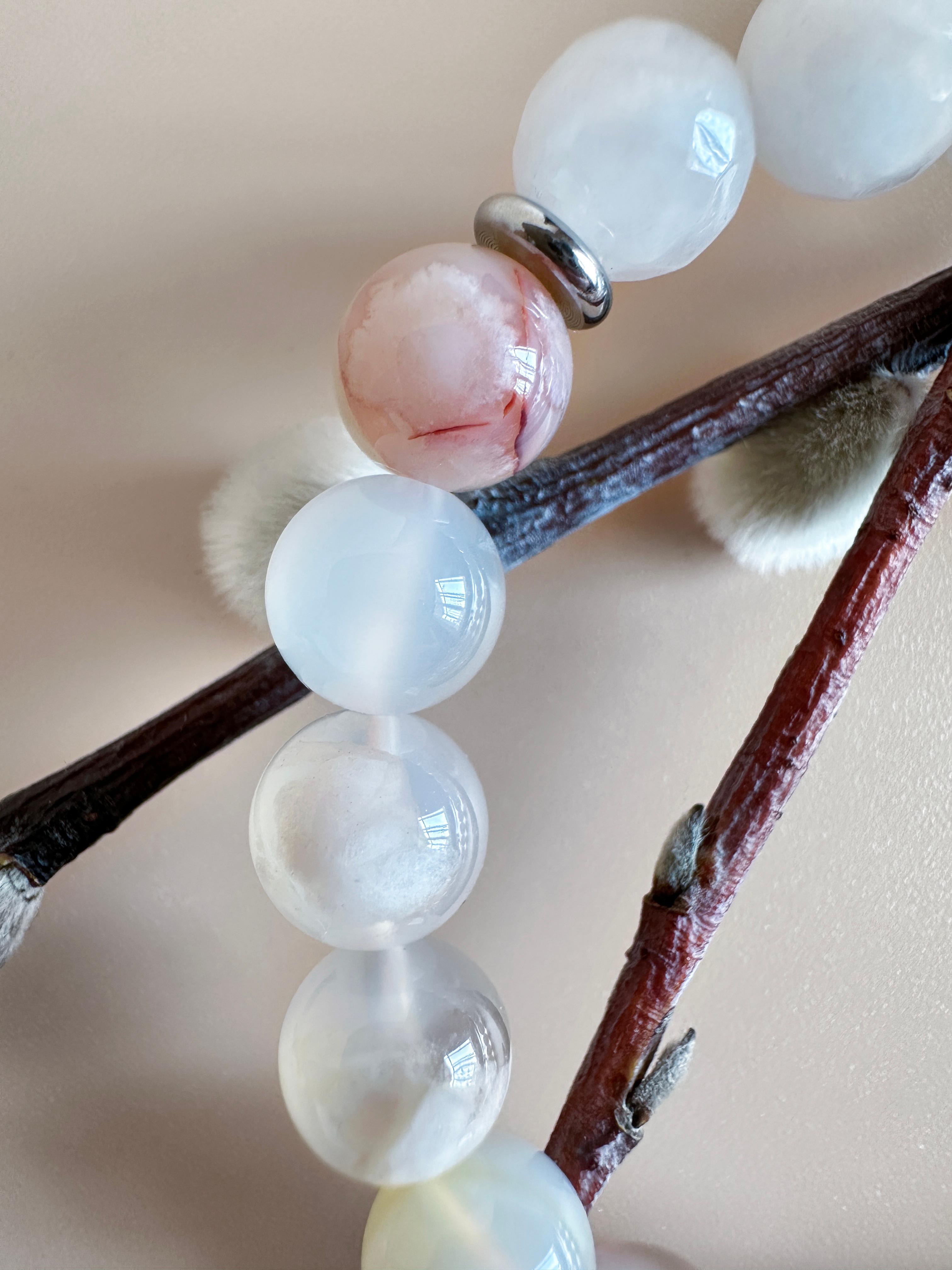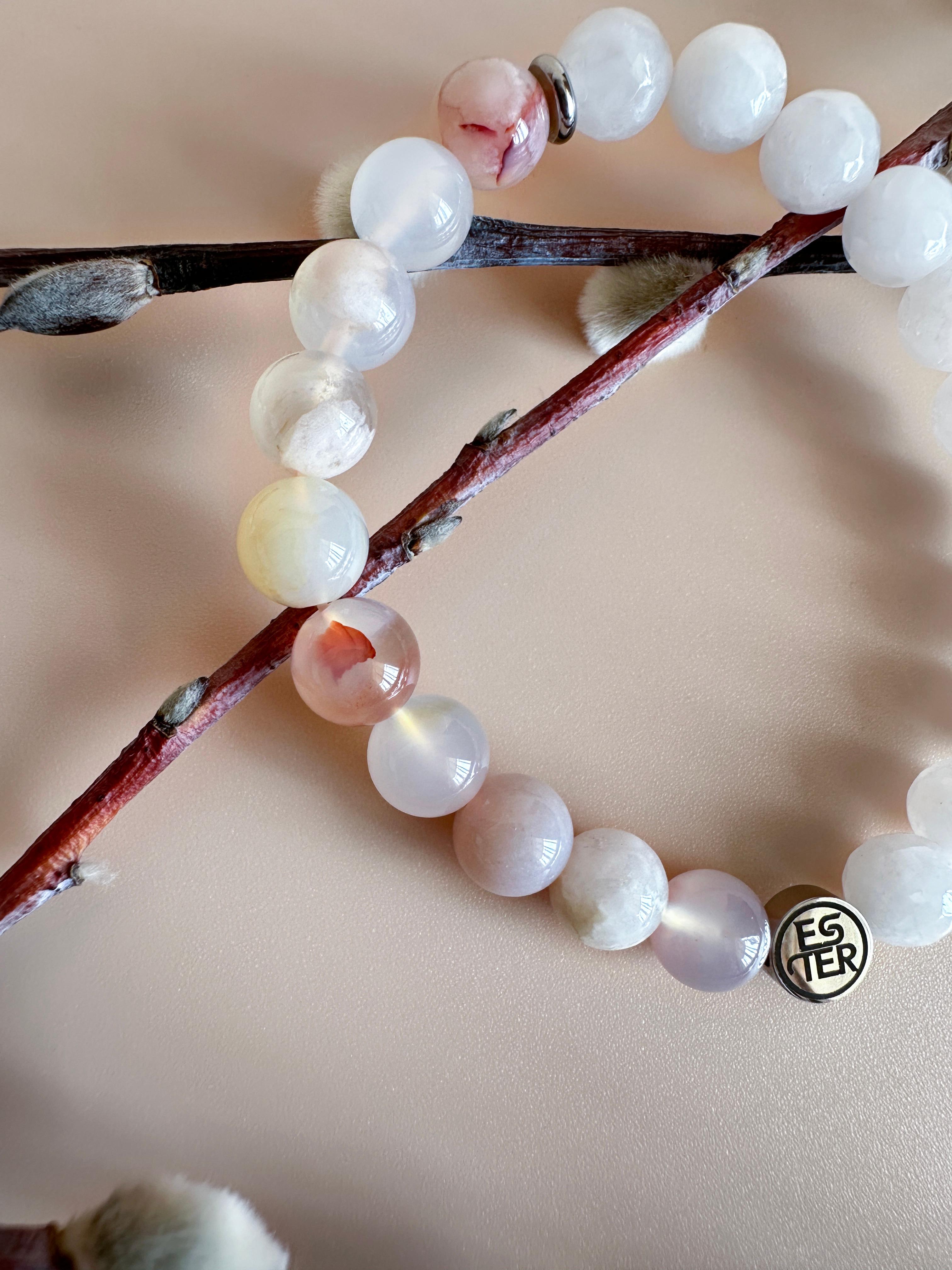 Энергетический браслет из натуральных камней — стильный аксессуар, сочетающий природную красоту и гармонию. Каждый элемент выполнен из минералов, собранных вручную, что придает изделию уникальный рельеф и глубину оттенков. Роскошное украшение "Нефритовый цветок" из природных камней, созданное для тех, кто ценит естественную красоту и энергетическую силу минералов. Браслет сочетает в себе нежный агат «Сакура» (или Цветочный агат) и благородный белый нефрит, создавая гармоничное сочетание природной энергии и изысканного стиля. Универсальный дизайн подходит как для повседневного образа, так и для вечернего выхода, дополняя образ без излишеств. Модель легко сочетается с одеждой любого стиля благодаря нейтральной цветовой гамме и минималистичной форме. Идеальный выбор для тех, кто ценит экологичность и индивидуальность. Подарите себе или близкому человеку аксессуар, который станет символом связи с природой и внутреннего баланса.